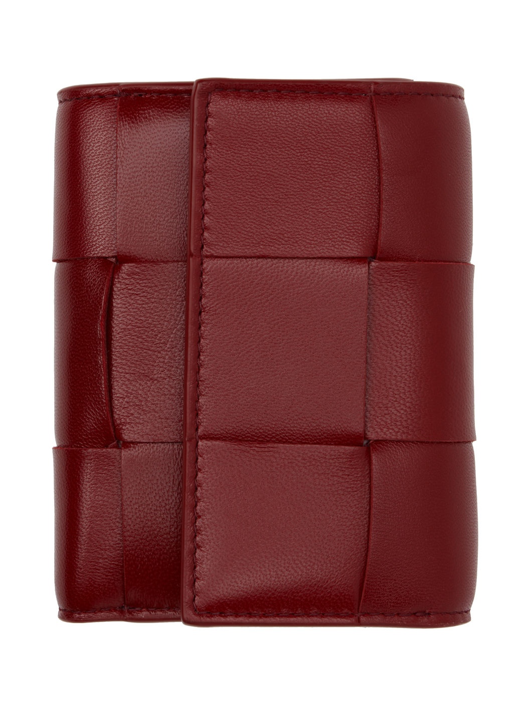Intreccio-woven nappa lambskin trifold wallet in red. · Burnished edges throughout · Press-stud closure · Note slot and two patch pockets · Zip compartment · Six card slots · Buffed calfskin lining · H3.5" x W4.5" x D1.25" Supplier color: Dark red/Bliss washed Body: lambskin. Lining: calfskin. Made in Italy 242798F040004