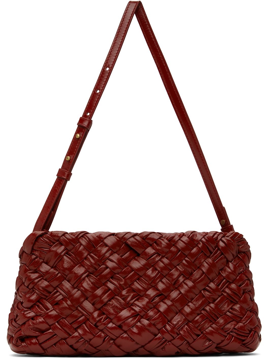 Padded intreccio-woven crinkled calfskin shoulder bag in red. · Adjustable and detachable shoulder strap · Zip closure · Unlined · Gold-tone brass hardware · H5.5" x W11.5" x D2.75" Supplier color: Rosewood Calfskin. Made in Italy 251798F048018