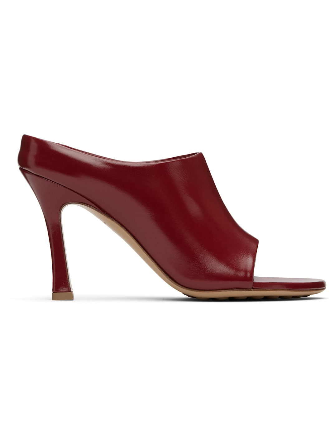 Buffed calfskin slip-on heel sandals. · Open almond toe · Logo embossed at padded footbed · Buffed lambskin lining · Stiletto heel with rubber injection · Leather sole with rubber injections · Heel: H3.75" Supplier color: Rosewood Upper: calfskin. Sole: leather, rubber. Made in Italy 251798F125005