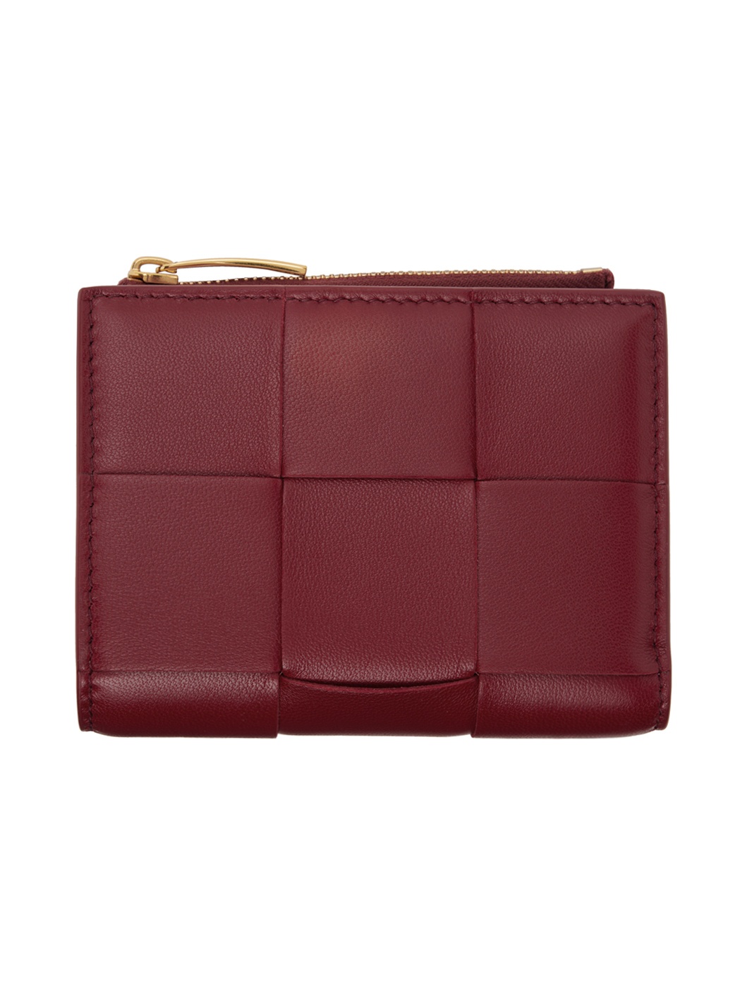 Intreccio-woven nappa calfskin bifold wallet in red. · Zip coin pocket at side · Press-stud closure · Note slot and two patch pockets · Six card slots · H3.5" x W4.5" x D1.25" Supplier color: Dark red Calfskin. Made in Italy 242798F040007