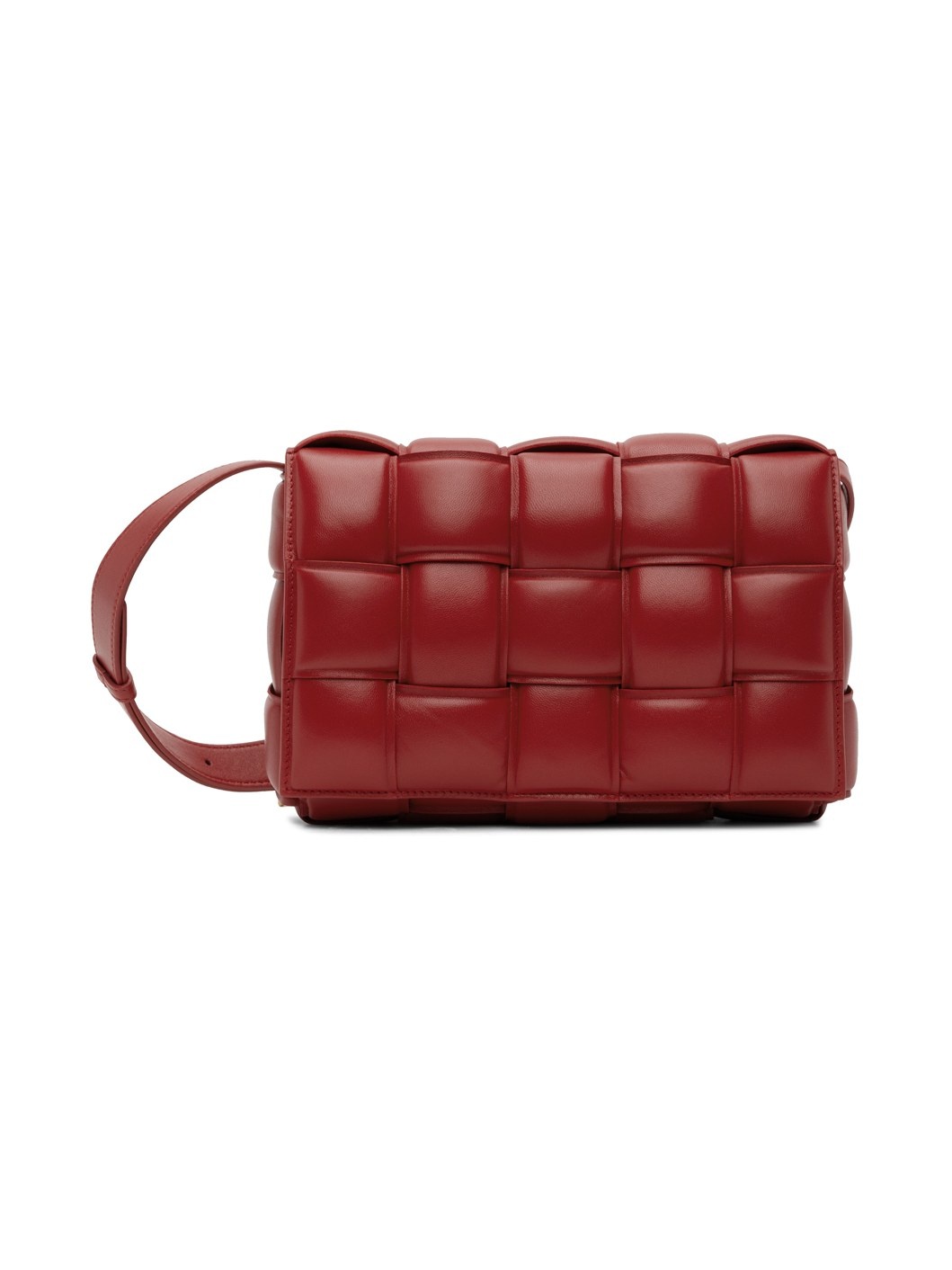 Padded intreccio-woven buffed lambskin shoulder bag in red. · Adjustable shoulder strap · Foldover flap with tab-slot fastening · Zip pocket and patch pocket at interior · Unlined · Logo-engraved gold-tone hardware · H6 x W9.5 x D2.25 in Supplier color: Apple candy Lambskin. Made in Italy 222798F048095