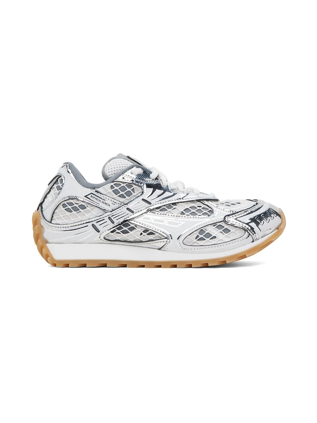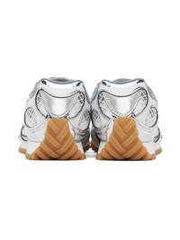 Low-top paneled mesh sneakers in silver tone and white. · Rubberized trim throughout · Lace-up closure · Padded tongue and collar · Logo printed at outer side · Jersey lining · Treaded rubber outsole Supplier color: Silver/White/Optic white