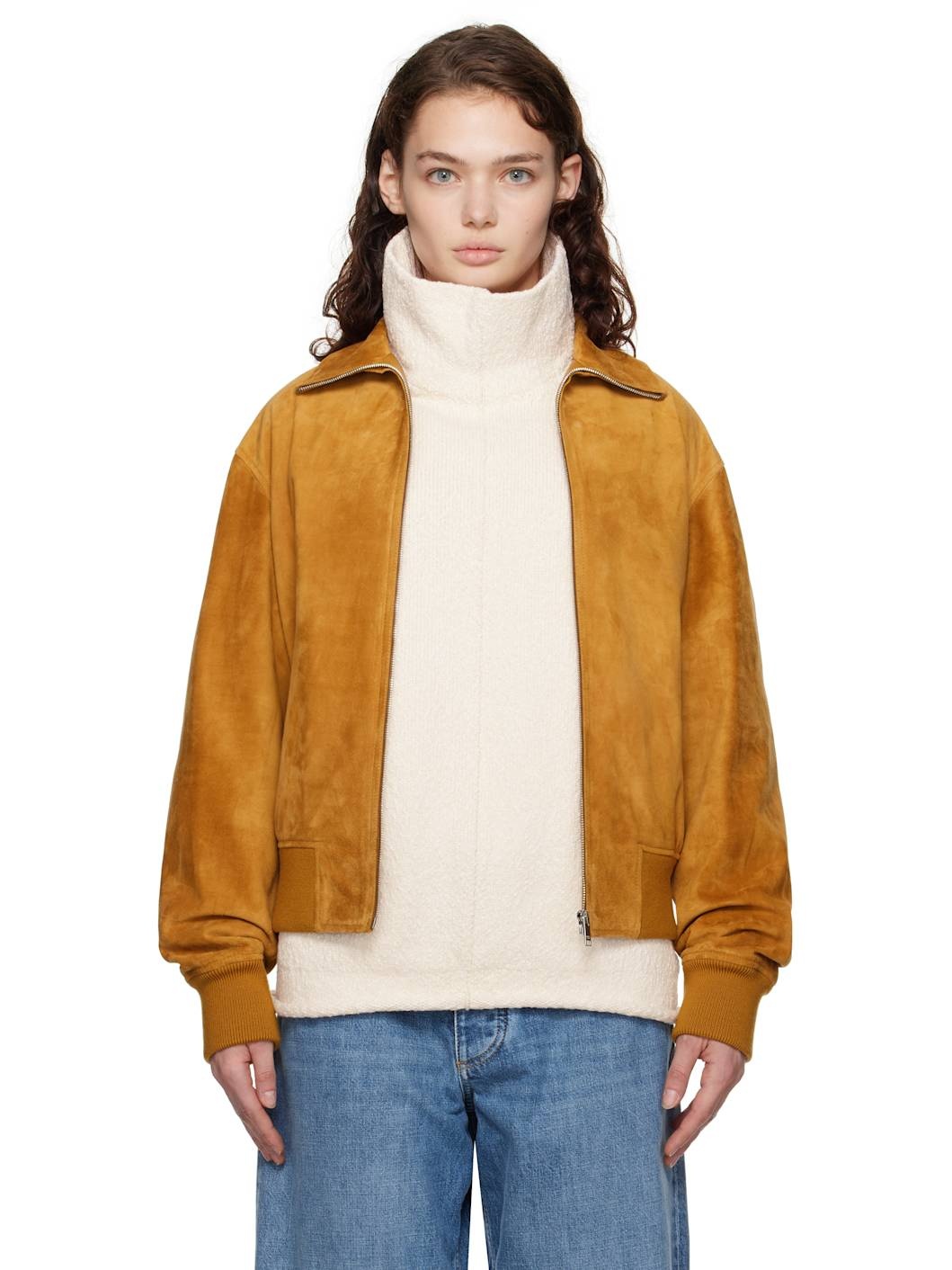 Suede calfskin jacket. · Spread collar · Zip closure · Welt pockets · Rib-knit hem and cuffs · Check pattern at viscose twill lining Supplier color: Peanut butter Body: 100% calfskin. Trim: 90% wool, 9% polyamide, 1% elastane. Lining: 100% viscose. Made in Italy 242798F063000