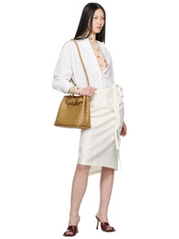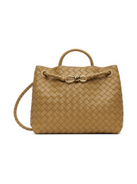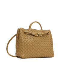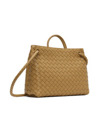 Intrecciato-woven grained nappa lambskin top handle bag in tan. · Rolled carry handle · Knotted hardware at sliding crossbody strap · Magnetic closure · Two-compartment interior · Zip pocket and patch pocket · Logo-engraved gold-tone brass hardware · H10" x W12" x D5" Supplier color: Dark praline 100% lambskin. Made in Italy 242798F046015