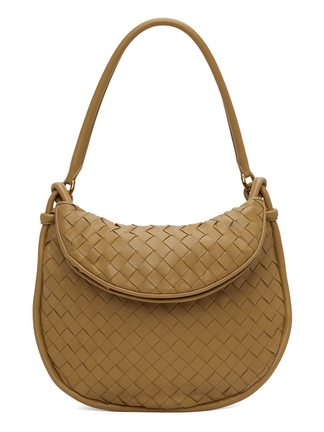 Intrecciato-woven grained lambskin shoulder bag in tan. · Detachable shoulder strap · Zip compartment at top · Zip closure · Zip pocket at interior · Buffed calfskin lining · Logo-engraved gold-tone hardware · H9.25" x W13.75" x D1.5" Supplier color: Dark praline/Brass Body: 100% lambskin. Lining: 100% calfskin. Made in Italy 242798F048037