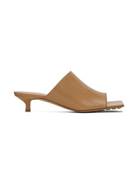 Buffed lambskin slip-on heeled sandals in tan. · Open square toe · Logo embossed at padded footbed · Covered kitten heel · Biodegradable leather sole with rubber injection · Heel: H1.5 in Supplier color: Saddle Upper: lambskin. Sole: leather. Made in Italy 232798F125000