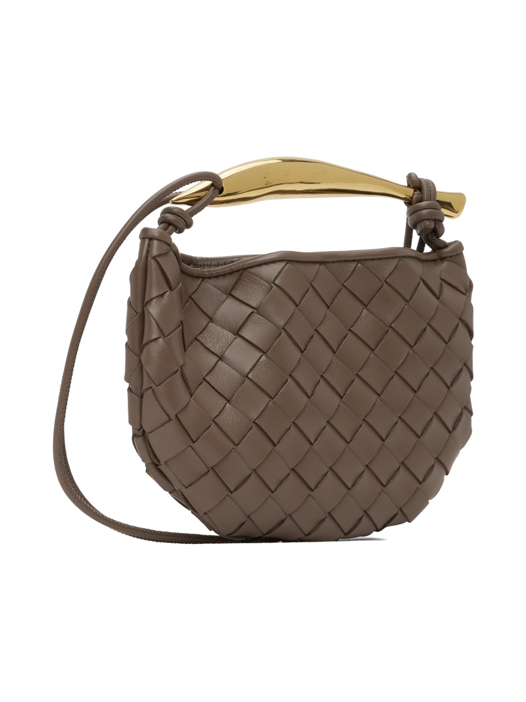 Intrecciato-woven buffed lambskin top handle bag in taupe. · Handcrafted sculptural carry handle · Fixed shoulder strap · Magnetic closure · Unlined · Gold-tone hardware · H5.5 x W8 x D1 in Supplier color: Taupe grey