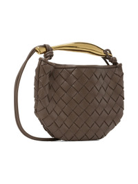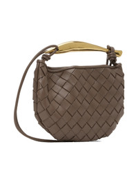 Intrecciato-woven buffed lambskin top handle bag in taupe. · Handcrafted sculptural carry handle · Fixed shoulder strap · Magnetic closure · Unlined · Gold-tone hardware · H5.5 x W8 x D1 in Supplier color: Taupe grey Lambskin. Made in Italy 232798F046010