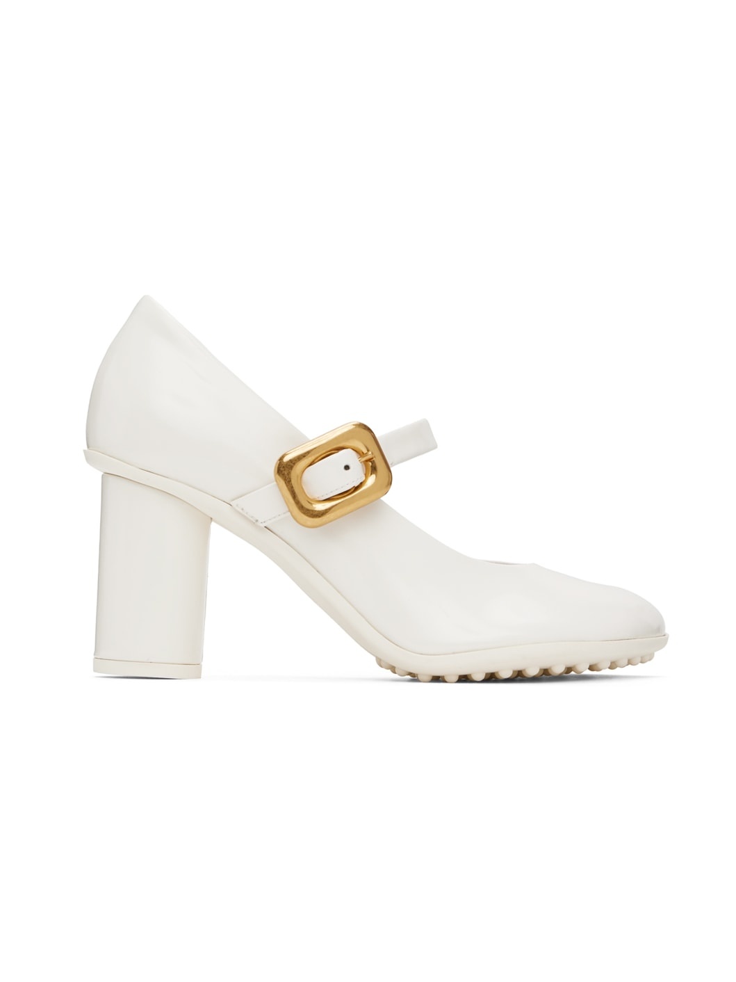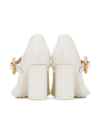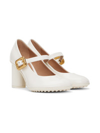 Polished lambskin Mary Jane-style heels in white. · Adjustable pin-buckle strap at vamp · Logo embossed at padded footbed · Grained lambskin lining · Covered block heel with rubber injection · Treaded rubber sole · Antiqued gold-tone hardware · Heel: H3" Supplier color: White Upper: lambskin. Sole: rubber. Made in Italy 241798F122004