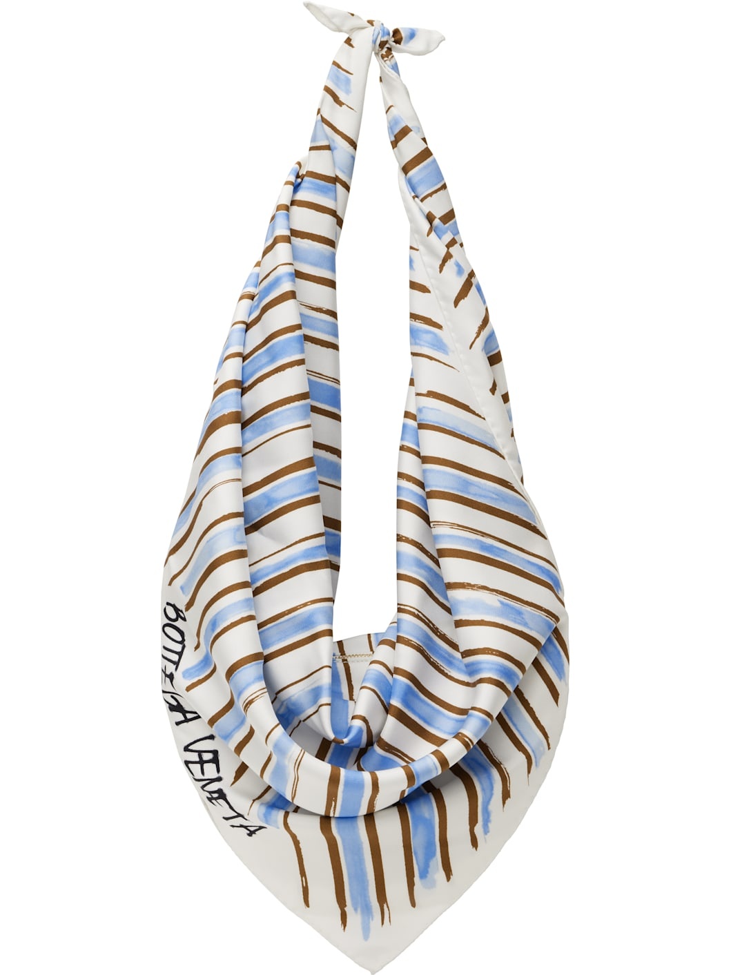 Silk satin shoulder bag in white, blue, and brown. · Stripes and draping throughout · Knot at integrated shoulder strap · Logo printed at face · Zip closure · Buffed lambskin interior · H8" x W10" x D1.75" · Total height: H13.75" Supplier color: Admiral/Brown Silk, lambskin. Made in Italy 251798F048011