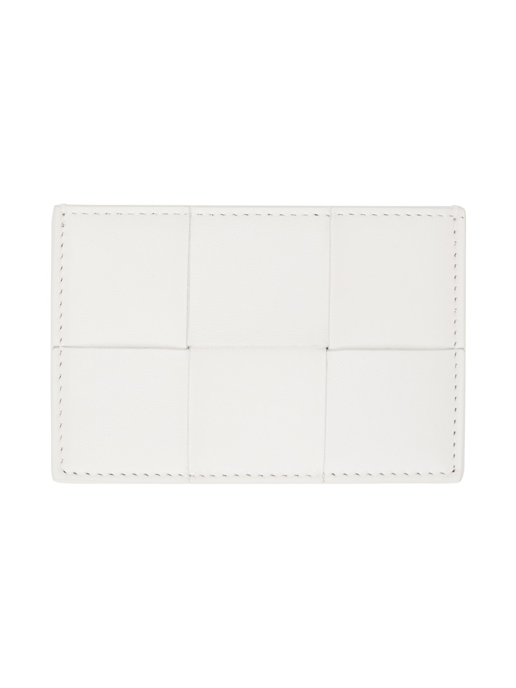 Intreccio-woven grained lambskin card holder in white. Burnished edges throughout. · Logo embossed at back face · Three card slots · Central note slot · Grained calfskin lining · H3 x W4.5 in Supplier color: White/Gold Lambskin. Made in Italy 232798F037000
