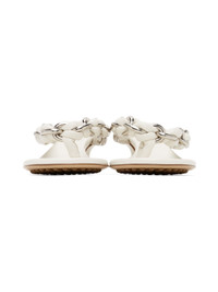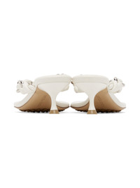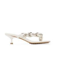 Nappa lambskin slip-on heeled sandals in white. Open round toe. Thong-style braided leather and chain link strap. Logo embossed at padded leather footbed. Kitten heel. Leather outsole in beige featuring rubber injections. Gold-tone hardware. Approx. 2" heel. Supplier color: String Upper: lambskin. Sole: leather, rubber. Made in Italy 211798F125035
