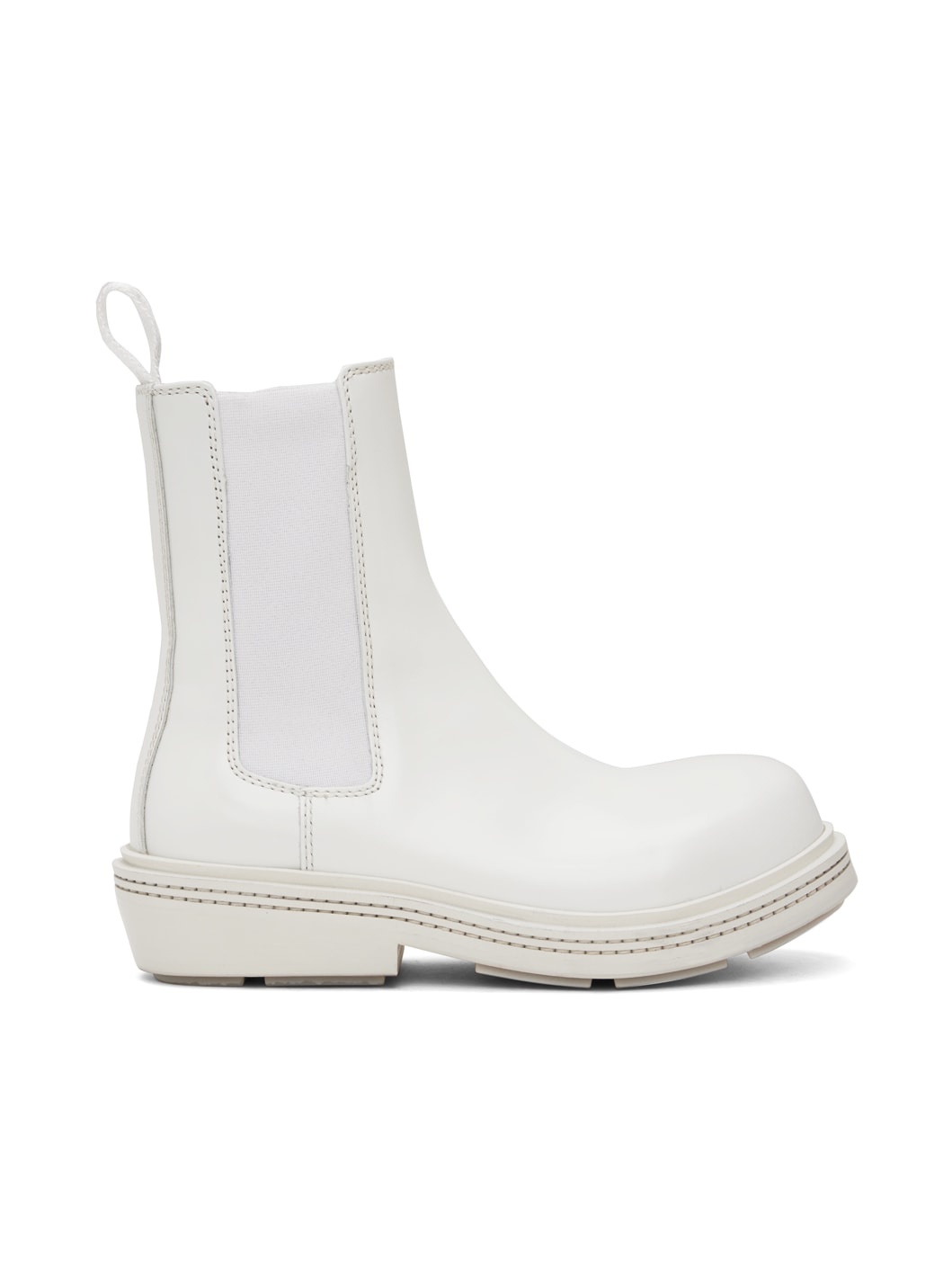 Ankle-high buffed calfskin Chelsea boots in white. · Steel cap toe · Pull-loop at heel tab · Elasticized gusset at sides · Tonal stitching at welt · Grained leather lining · Stacked leather heel · Treaded rubber sole · Heel: H1.5 in Supplier color: Optic white Upper: leather. Sole: rubber. Made in Italy 232798F113004