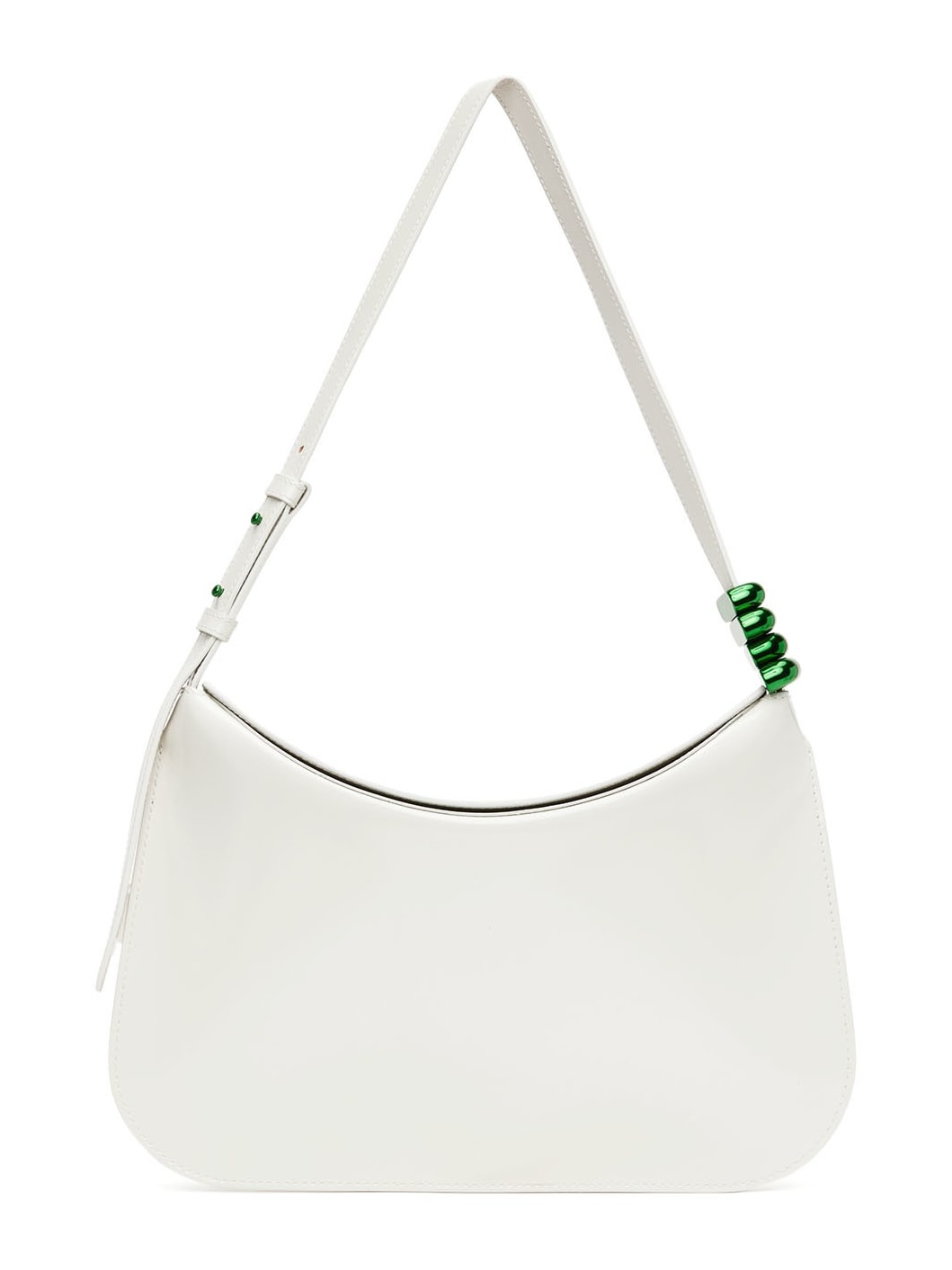 Polished calfskin shoulder bag in white. · Adjustable shoulder strap with sliding metal hardware · Logo embossed at face · Twin foldover flaps at main compartment · Tonal buffed lambskin lining · Green hardware · H8.25 x W12.5 x D4 in Supplier color: White/Parakeet Calfskin. Made in Italy 221798F048100