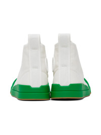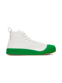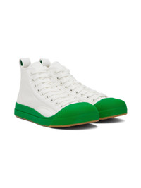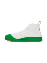 High-top cotton canvas sneakers in white and green. · Rubber cap toe · Lace-up closure · Pull-loop at heel collar · Rubberized logo patch at inner side · Treaded rubber sole Supplier color: Optic white/Parakeet Upper: textile. Sole: rubber. Made in Italy 232798F127000