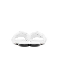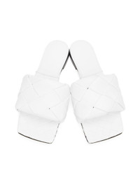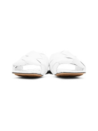 Intrecciato-woven nappa lambskin slip-on sandals in off-white. Open square toe. Logo embossed at tonal padded nappa footbed. Leather and pebble rubber sole in tan. Supplier color: Optic white Upper: lambskin. Sole: leather, rubber. Made in Italy 202798F124066