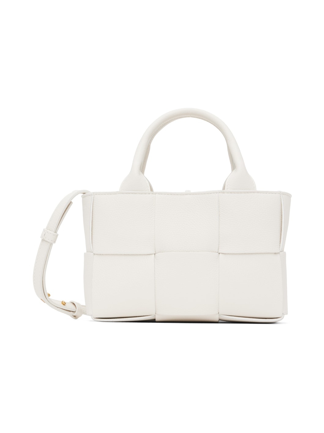 Intreccio-woven grained calfskin tote in white. · Twin rolled carry handles · Detachable and adjustable shoulder strap · Logo embossed at side · Self-tie fastening at throat · Detachable logo-embossed suede pouch at interior · Bonded suede lining · Gold-tone hardware · H5.25 x W8.5 x D3 in Supplier color: White/Gold Calfskin. Made in Italy 231798F046004