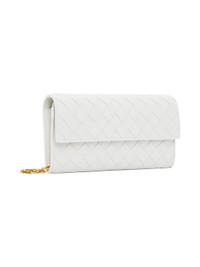 Intrecciato-woven grained calfskin shoulder bag in white. · Detachable chain link shoulder strap · Accordion panel at sides · Foldover flap with magnetic press-stud closure · Six card slots and one zip pocket at interior · Gold-tone hardware · H4.5 x W8.25 x D1 in Supplier color: Chalk/Gold Calfskin. Made in Italy 231798F048064