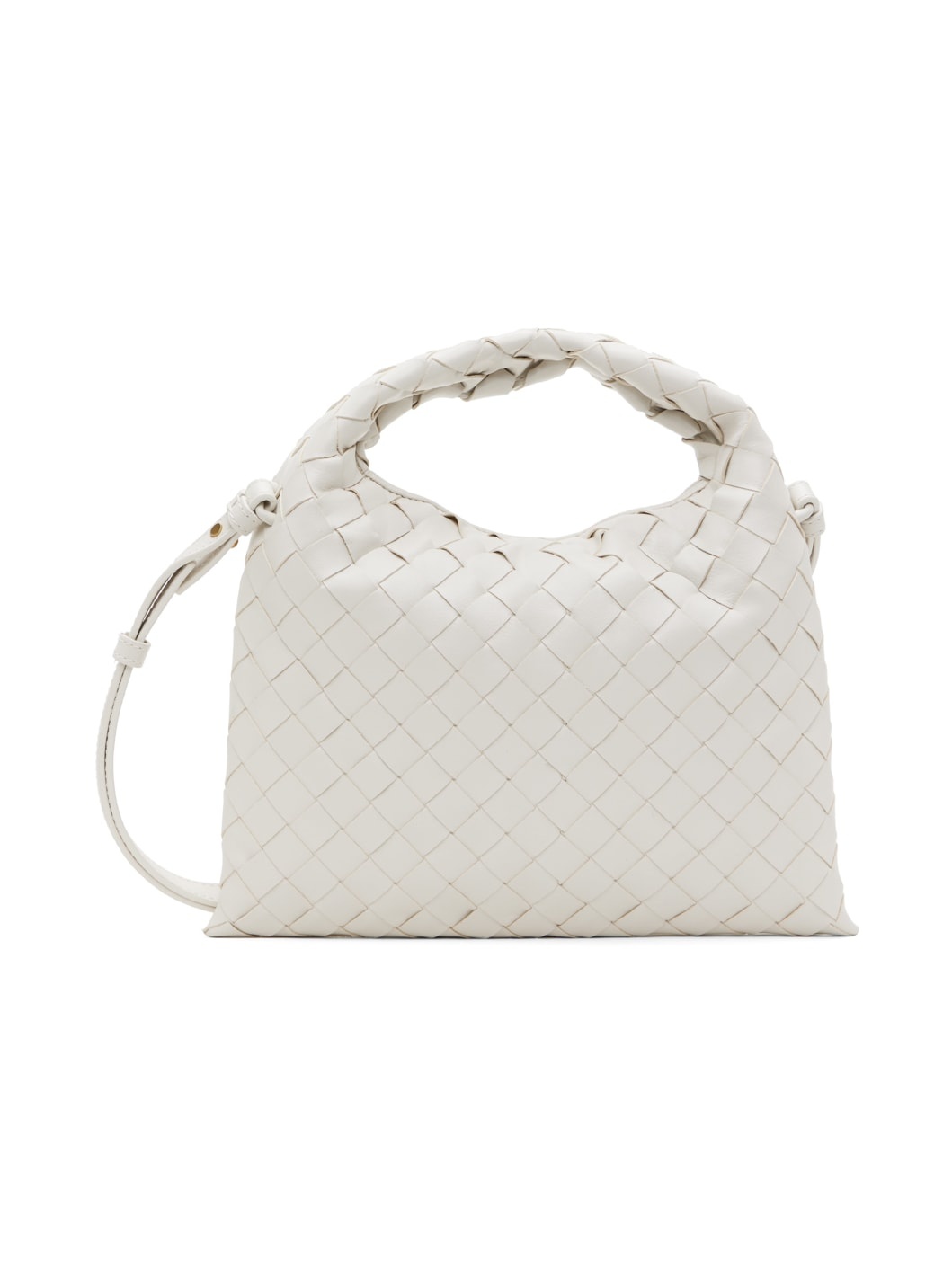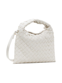 Intrecciato-woven grained calfskin shoulder bag in white. · Integrated carry handle · Adjustable and detachable crossbody strap · Magnetic closure · Grained calfskin lining · H7" x W9.5" · Total height: H9" Supplier color: White/Brass 100% calfskin. Made in Italy 241798F048018