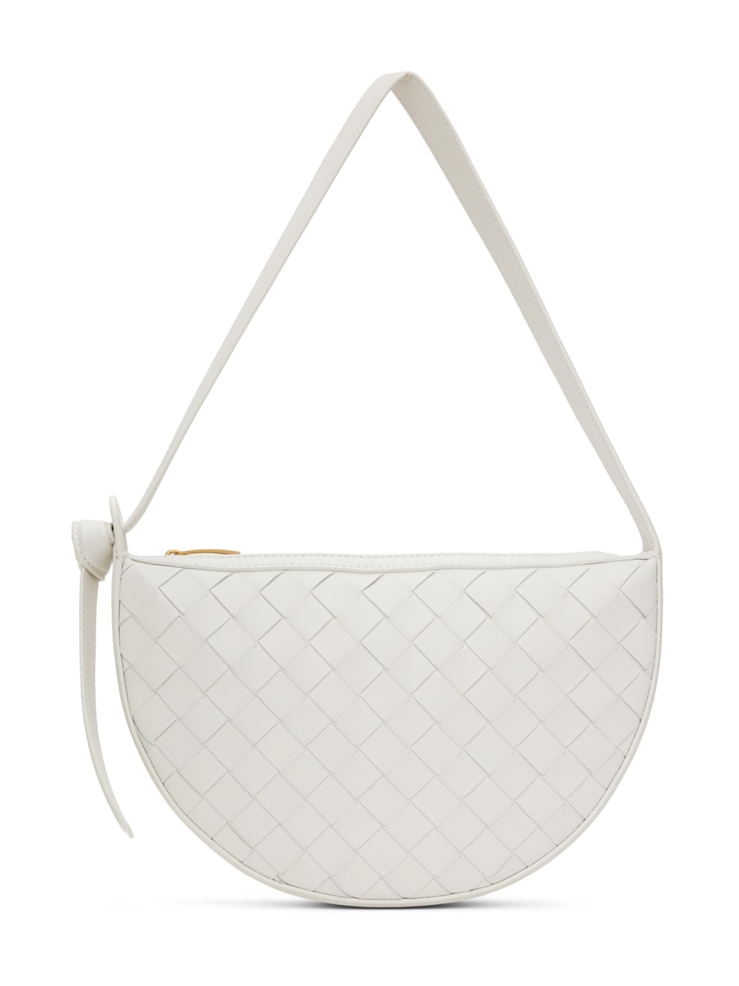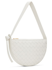 Intrecciato-woven grained nappa lambskin shoulder bag in white. · Knotted accent at fixed shoulder strap · Zip closure · Card slot at interior · Buffed calfskin lining · Gold-tone hardware · H6" x W9" x D1.5" · Total height: H13.5" Supplier color: White/Gold Lambskin. Made in Italy 232798F048055