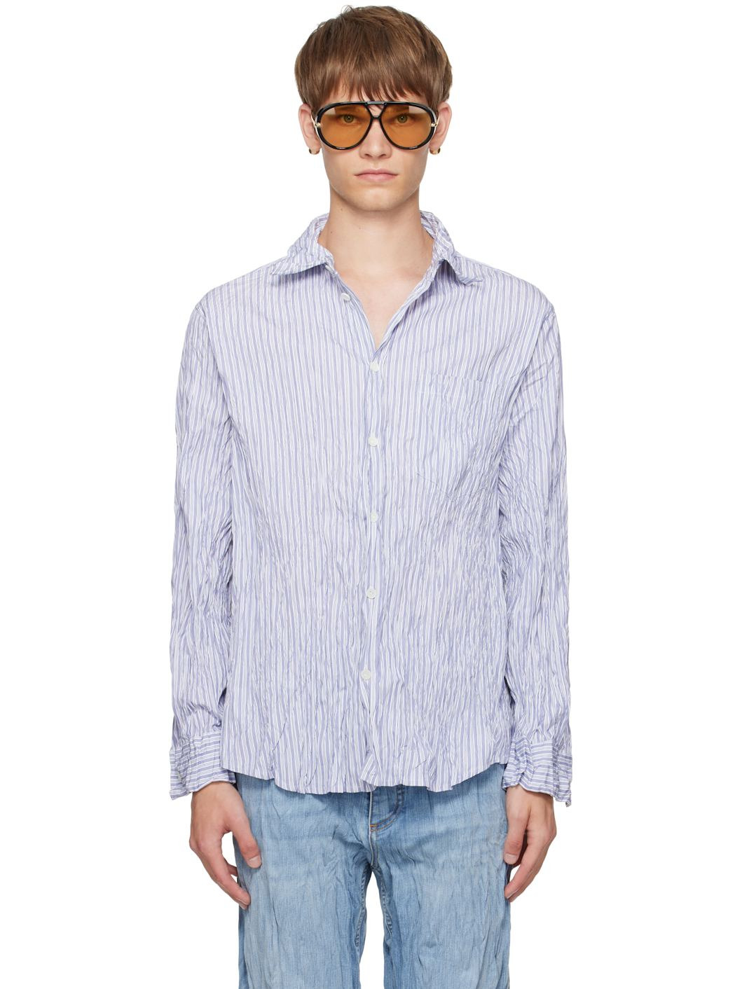 Crinkled cotton-blend oxford cloth shirt. · Stripes throughout · Spread collar · Button closure · Patch pocket at chest · Shirttail hem · Buttoned barrel cuffs Supplier color: Blue/White 84% cotton, 16% polyester. Made in Italy 251798M192015