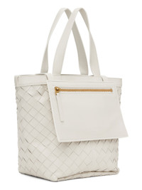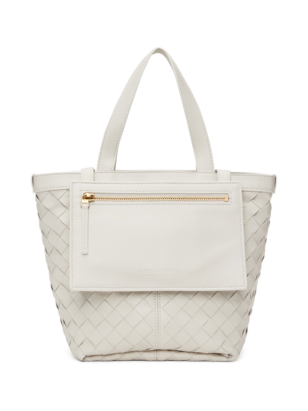 Intrecciato-woven buffed lambskin tote in white. · Fixed carry handles · Open throat · Zip pouch at interior · Buffed calfskin lining · H9 x W10 x D5 in Supplier color: Chalk/Brass Lambskin, calfskin. Made in Italy 232798F049000