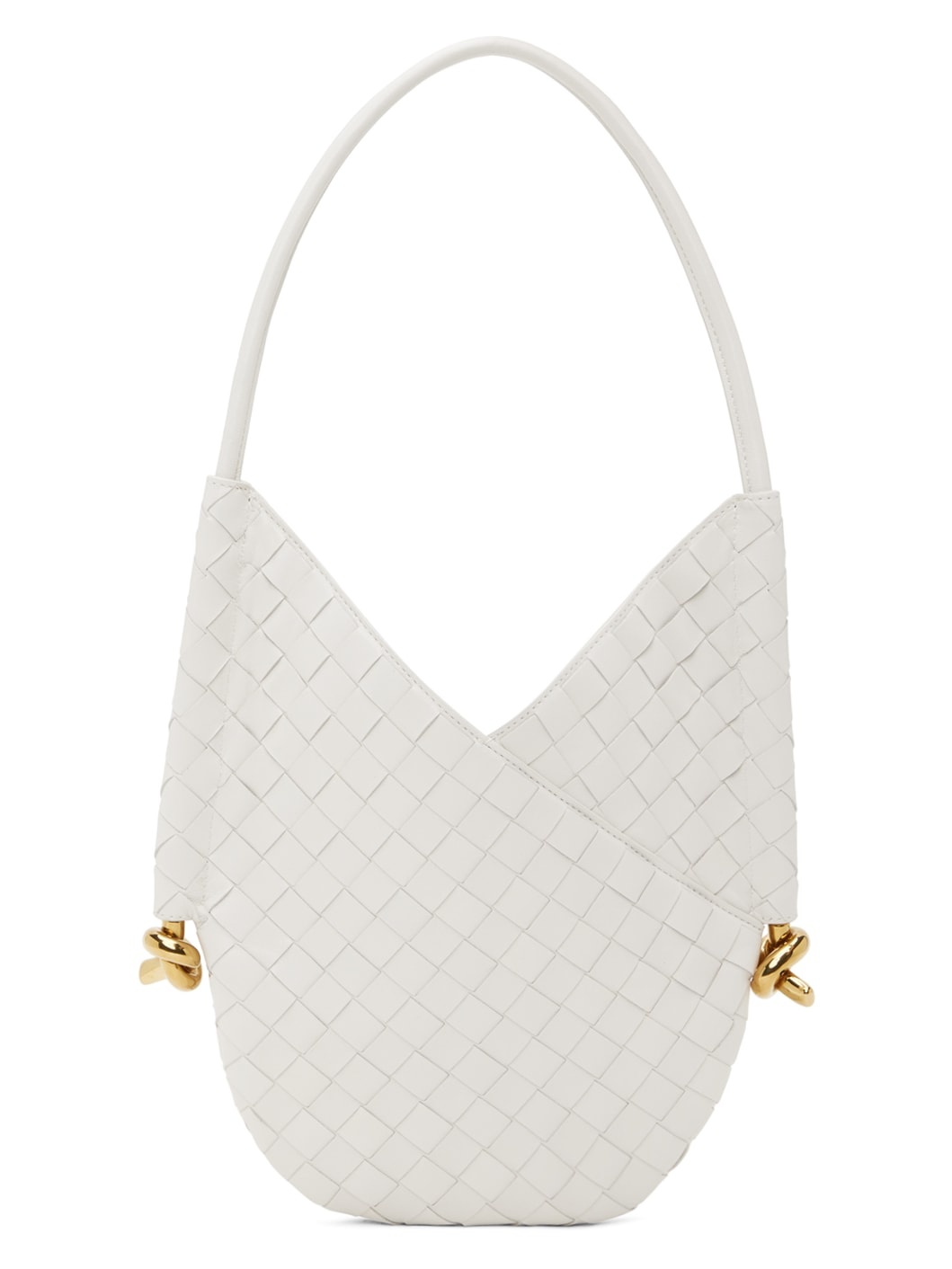 Intrecciato-woven grained leather shoulder bag in white. · Fixed shoulder strap · Knotted hardware at sides · Self-tie fastening at throat · Integrated suede zip pouch at interior · Suede lining · H11.5" x W9" · Total height: H17.5" Supplier color: White/Brass Leather. Made in Italy 241798F048050