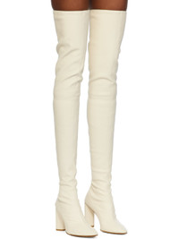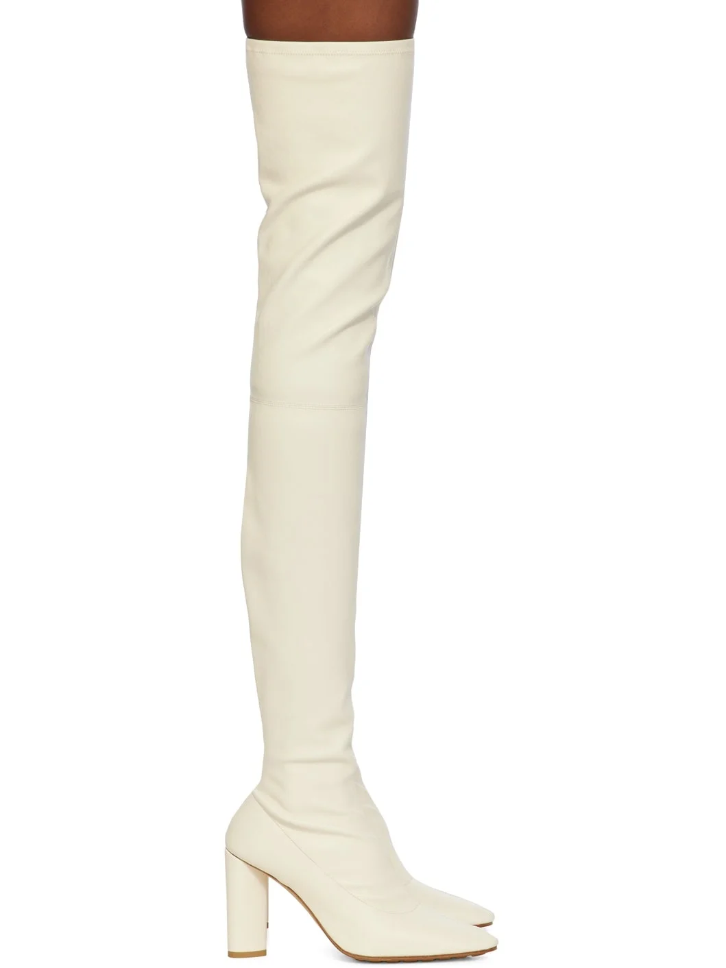 Thigh-high nappa lambskin boots in white. · Pointed toe · Lambskin lining · Covered cylindrical block heel with rubber injection · Leather sole with rubber injections · Heel: H4" Supplier color: White Upper: lambskin. Sole: leather, rubber. Made in Italy 241798F116000