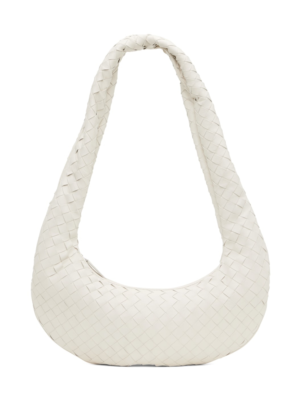 Intrecciato-woven grained lambskin tote in white. · Fixed carry handle · Zip closure · Zip pocket at interior · Taffeta lining · H7 x W16.5 x D2 in Supplier color: White/Silver Lambskin. Made in Italy 232798M172001