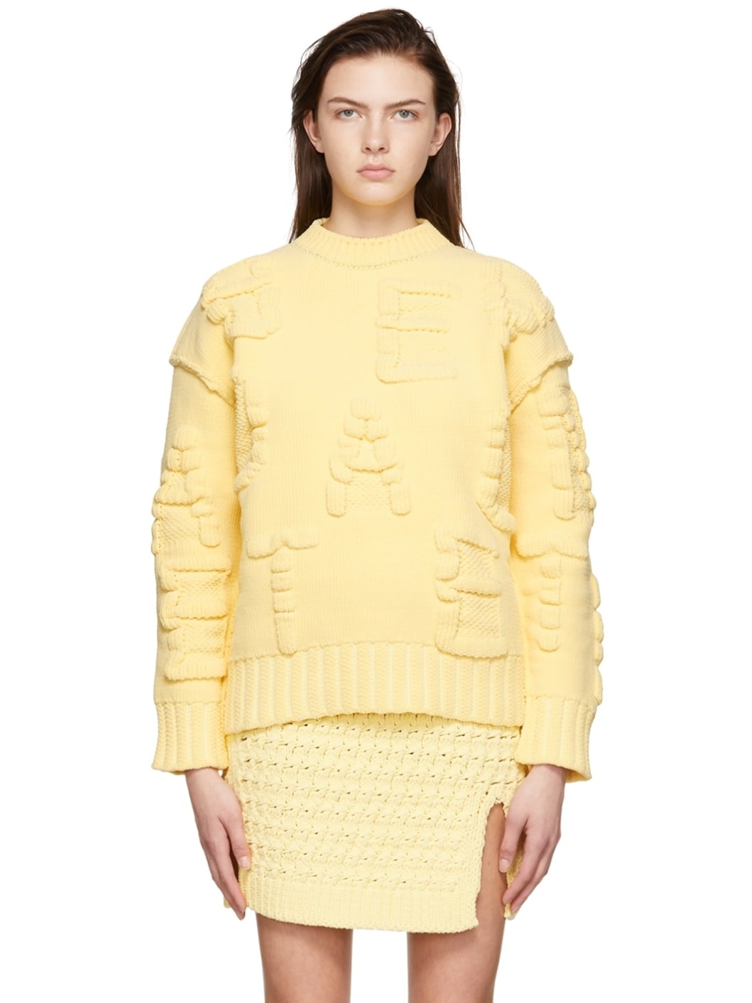 Long sleeve stretch knit nylon sweater in yellow. · Rib knit crewneck collar · Rib knit cuffs and hem Supplier color: Zest washed 99% polyamide, 1% elastane. Made in Italy 221798F096001