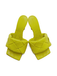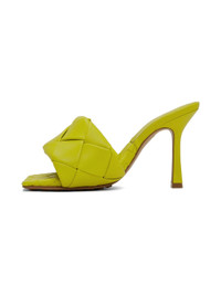 Intreccio-woven nappa lambskin slip-on heeled sandals in yellow. · Open square toe · Logo stamped at lambskin footbed · Covered stiletto heel · Leather outsole in tan with pebbled rubber injections · Heel: H3.75 in Supplier color: Kiwi Upper: lambskin. Sole: leather, rubber. Made in Italy 221798F125003