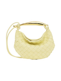 Intrecciato-woven buffed lambskin shoulder bag in yellow. · Sculptural metal carry handle · Fixed shoulder strap · Magnetic closure · Unlined · H5.5 x W8.5 x D0.5 Supplier color: Ice cream muse Lambskin. Made in Italy 232798F048023