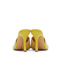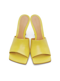 Buffed lambskin slip-on heels in yellow. Open square toe. Logo embossed at beige footbed. Covered stiletto heel. Leather sole in tan with pebbled rubber injection. Approx. 3.75" heel. Supplier color: Pear Lambskin. Made in Italy 202798F125069