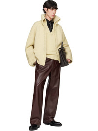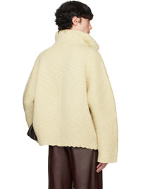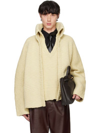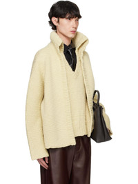 Relaxed-fit textured knit wool cardigan. Knit stretch wool-blend sweater-style underlay. · Layered construction · Stand collar and V-neck · Rib-knit collars, placket, and hem · Open front Supplier color: Soapstone Body: 100% wool. Lining: 97% wool, 2% polyamide, 1% elastane. Made in Italy 242798M200002