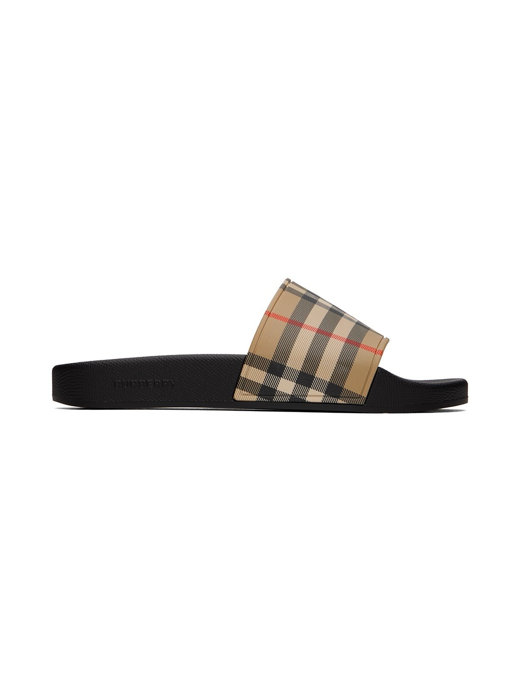 Rubber slides in beige and black. · Check pattern throughout · Open toe · Logo embossed at molded rubber footbed · Logo at rubber midsole · Treaded rubber sole Supplier color: Archive beige Rubber. Made in Italy 242376F124002