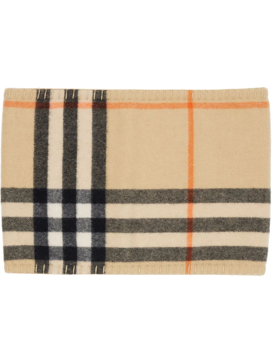 Brushed double-faced cashmere snood. · Check pattern throughout · Blanket stitching at edges · H10" x W14.5" Supplier color: Sand beige 100% cashmere. Made in United Kingdom 261376F029023