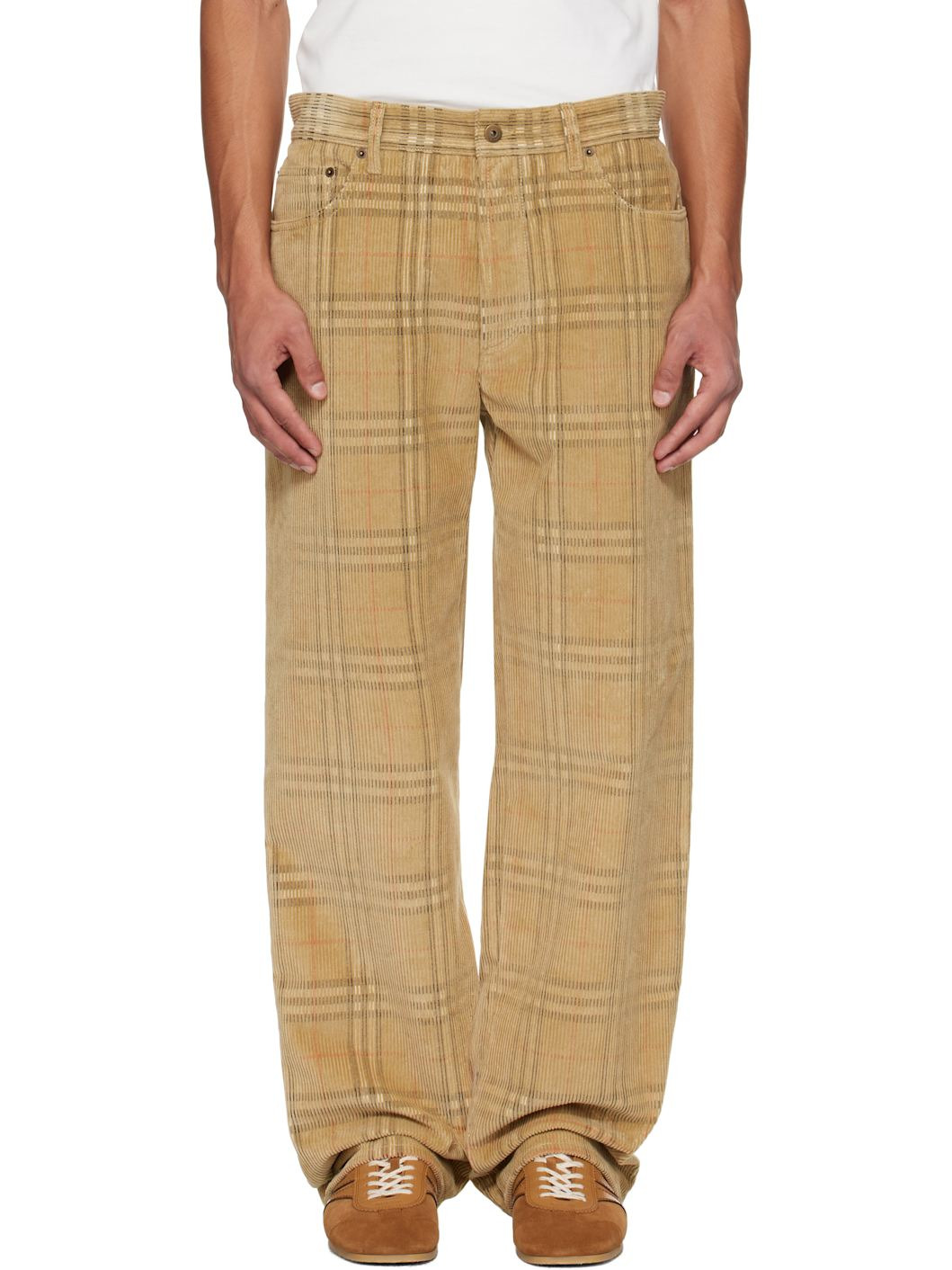 Cotton corduroy trousers. · Check pattern throughout · Loose-fit · Belt loops · Five-pocket styling · Button fly · Logo patch at back waistband Supplier color: Sand IP check 100% cotton. Made in Italy 252376M191003