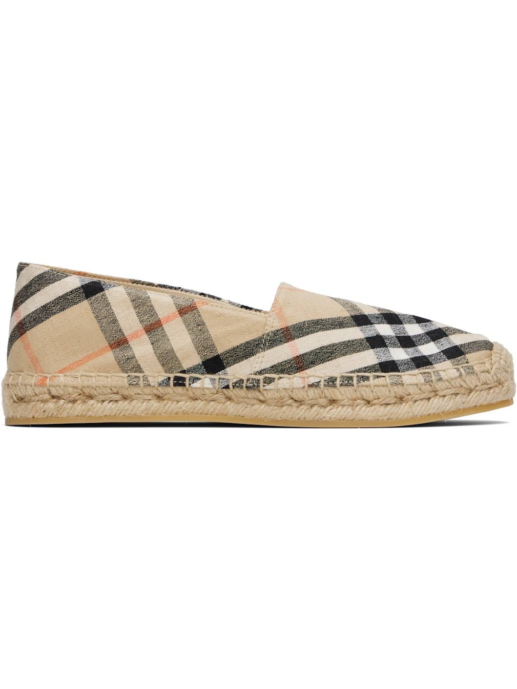 Stretch linen canvas espadrilles in beige. · Check pattern throughout · Woven jute cap toe · Unlined · Blanket stitching at welt · Braided jute midsole · Treaded rubber outsole Supplier color: Sand Upper: textile. Sole: rubber. Made in Spain 252376F119000