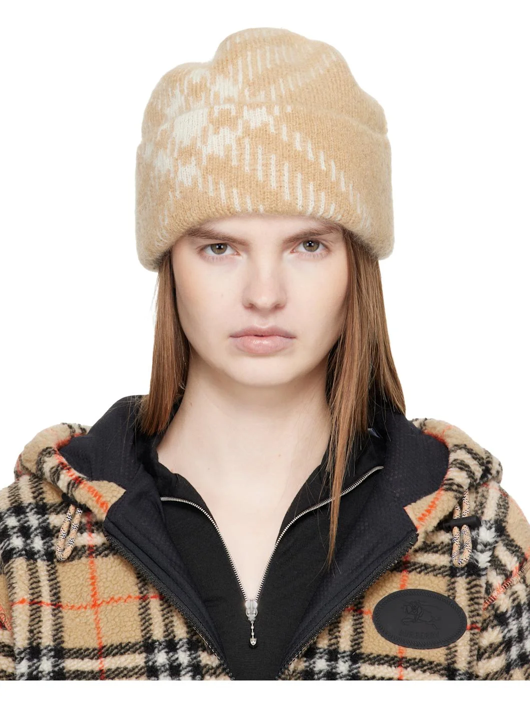 Brushed rib-knit mohair- and wool-blend beanie. · Jacquard check pattern throughout · Rolled brim Supplier color: Sand beige 51% mohair, 37% polyamide, 12% wool. Made in United Kingdom 261376F014004
