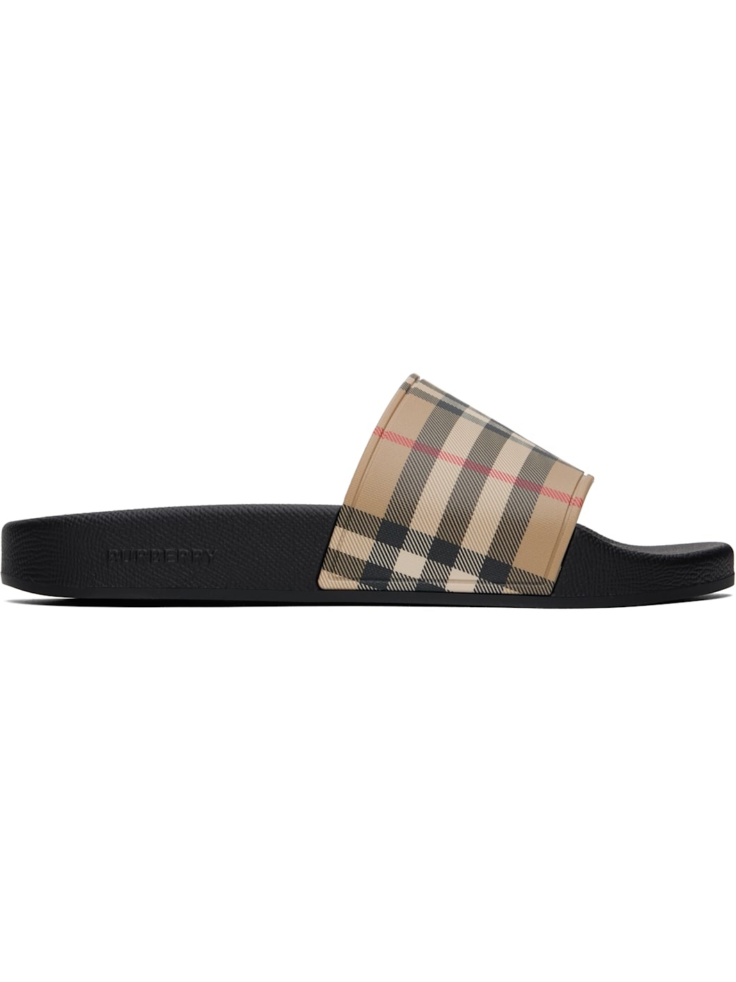 Rubber pool slides in beige. · Open toe · Check pattern at vamp · Logo embossed at molded footbed · Treaded rubber sole Supplier color: Archive beige Rubber. Made in Italy 251376F124000