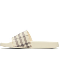 Rubber slides. · Open toe · Check pattern at vamp · Logo embossed at molded footbed · Treaded rubber sole Supplier color: Light beige check Upper: rubber. Sole: rubber. Made in Italy 261376F124005
