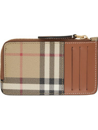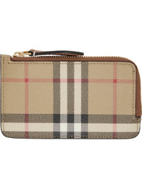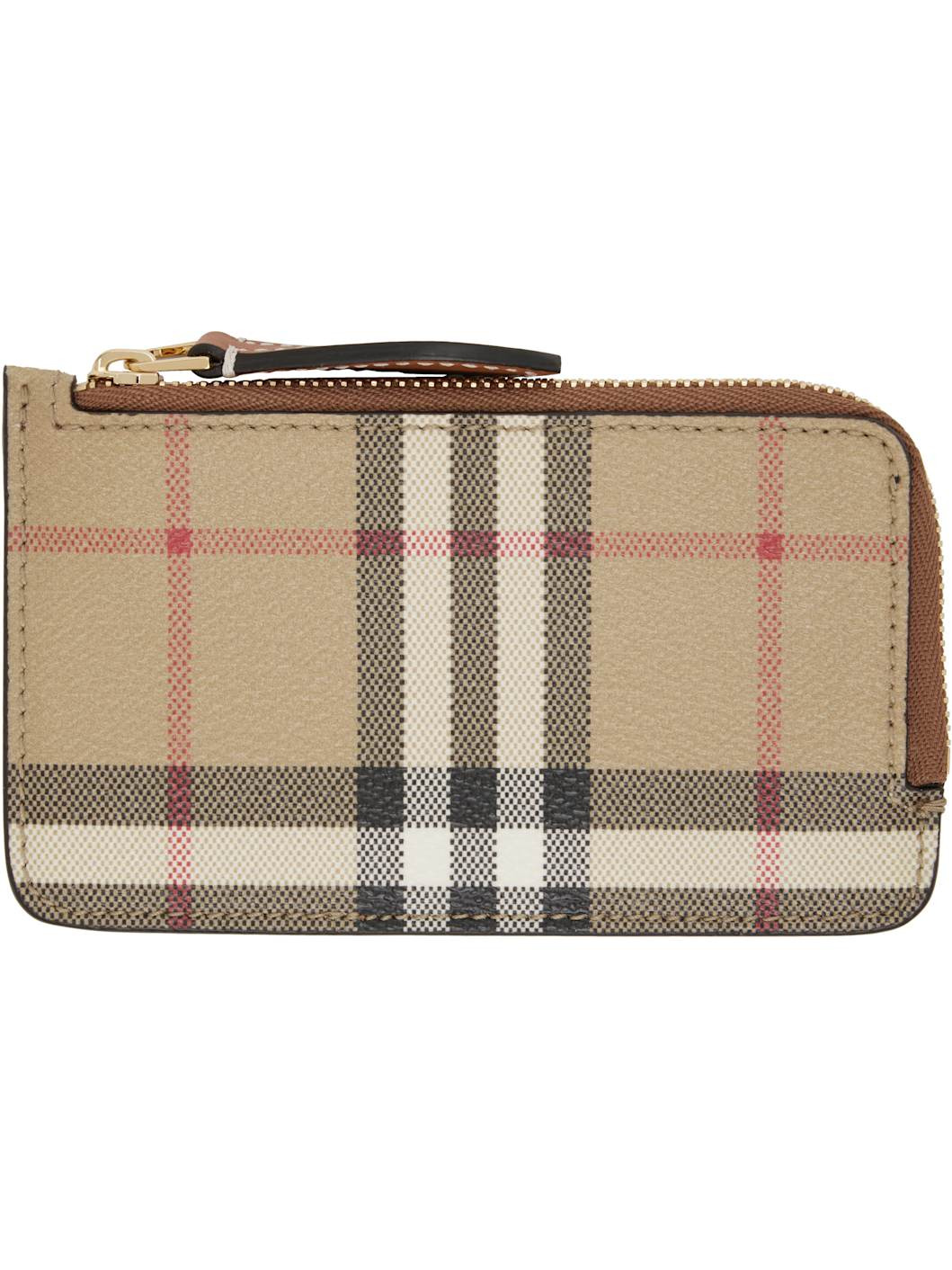 Pebble-grained faux-leather and buffed calfskin card holder. · Hand-painted edges · Signature check pattern throughout · Three card slots at back face · Zip closure · Canvas lining · H3" x W5" Supplier color: Vintage check/Briar brown Calfskin, synthetic. Made in Italy 252376F040001