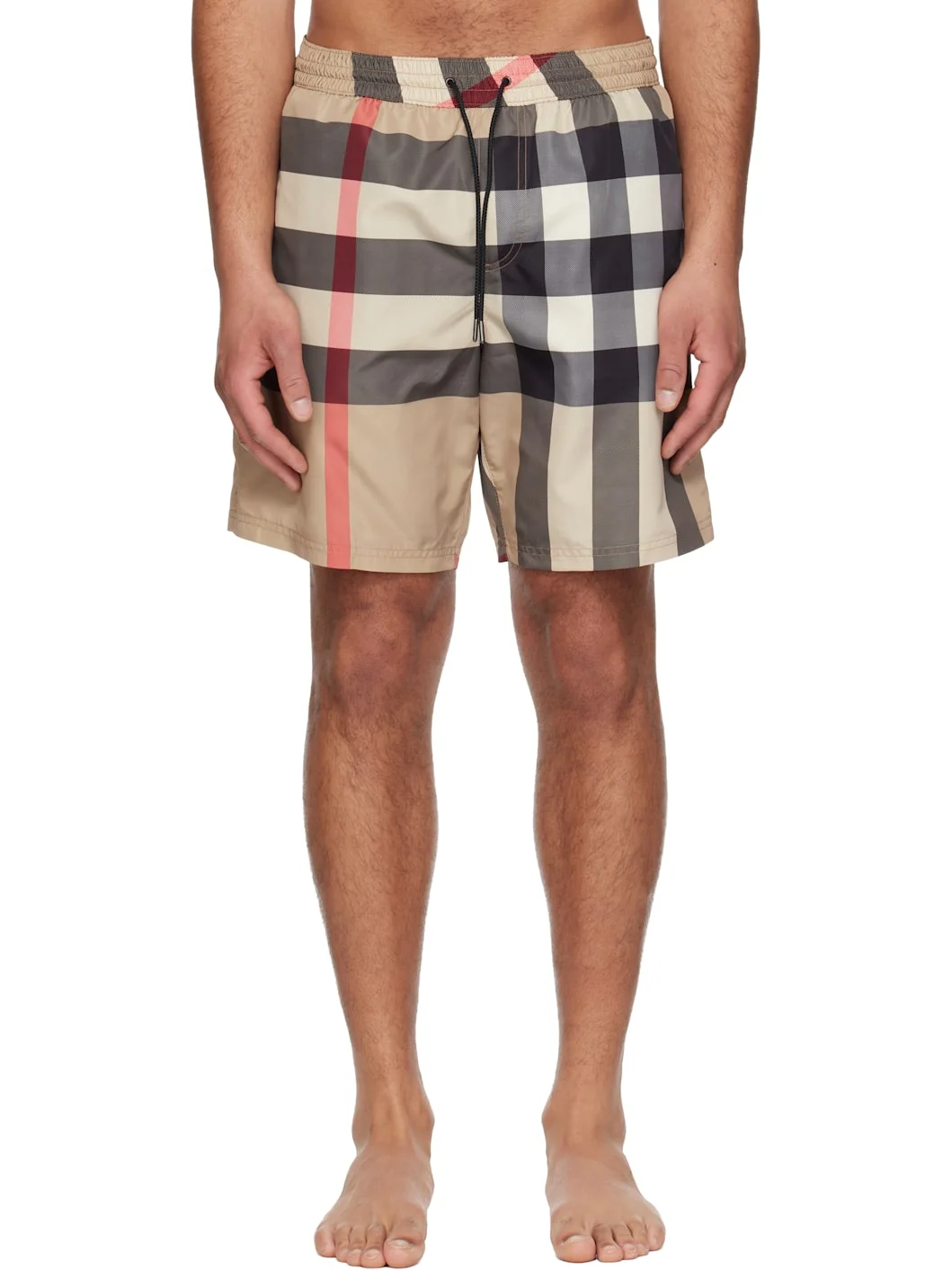 Recycled polyester taffeta swim shorts. · Check pattern throughout · Drawstring at elasticized waistband · Three-pocket styling · Vented cuffs · Patch pocket at interior · Briefs-style mesh lining Supplier color: Archive beige check Body: 100% recycled polyester. Lining: 100% polyester. Made in Thailand 261376M208005
