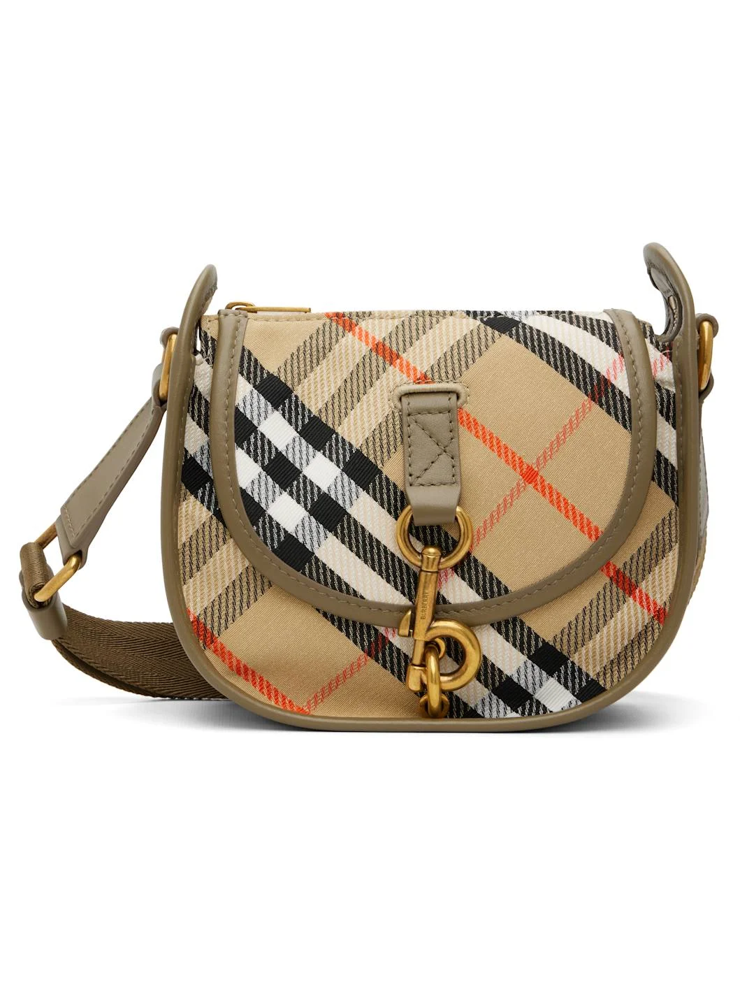 Twill messenger bag. · Check pattern and buffed calfskin trim throughout · Adjustable crossbody strap · Flap pocket with clasp at face · Zip closure · Patch pocket at interior · H6.5" x W7.5" x D3.5" Supplier color: Sand beige Textile, calfskin. Made in Italy 261376F048009