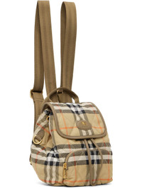Quilted twill backpack. · Check pattern and grained calfskin trim throughout · Rolled carry handle · Adjustable shoulder straps · Zip pocket at face · Logo patch at magnetic foldover flap · Drawstring closure · Patch pocket at interior · Sateen lining · H9" x W7.5" x D4" Supplier color: Sand beige Textile. Made in Romania 261376F042000
