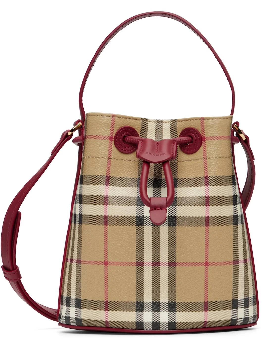 Coated cotton-blend canvas shoulder bag. · Check pattern throughout · Calfskin carry handle and adjustable crossbody strap · Drawstring closure · Cotton twill lining · Gold-tone hardware · H7” x W8.75” x D4.25” Supplier color: Archive Beige/Ruby Red 55% polyurethane, 20% polyester, 20% cotton. Made in Italy 261376F048006