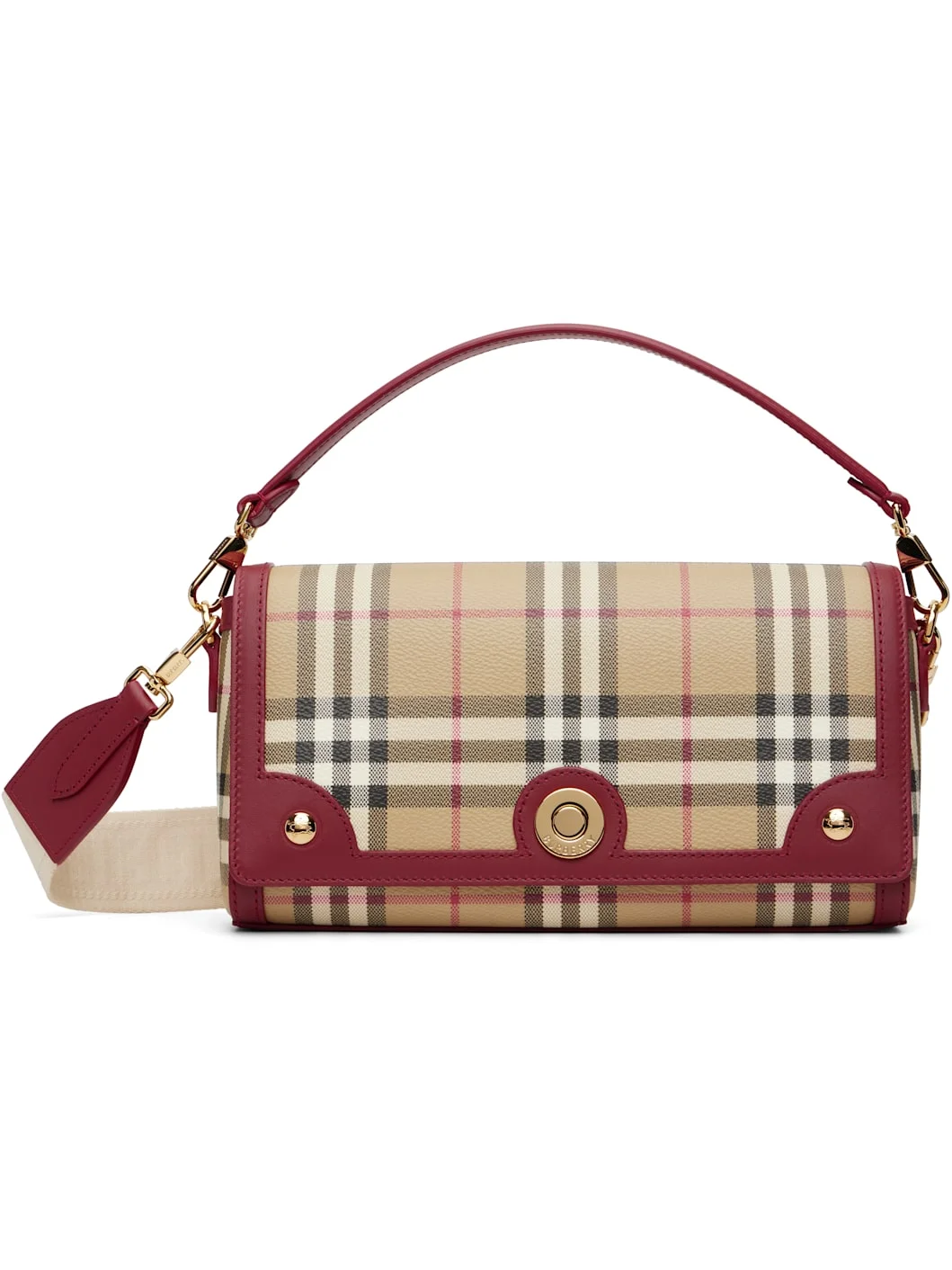 Coated cotton-blend canvas shoulder bag. · Check pattern and calfskin trim throughout · Detachable carry handle · Adjustable and detachable webbing crossbody strap · Magnetic flap closure · Card slot at interior · Cotton twill lining · Gold-tone hardware · H6.5” x W9.5” x D2.25” Supplier color: Archive Beige/Ruby Red 55% polyurethane, 25% polyester, 20% cotton. Made in Italy 261376F040000
