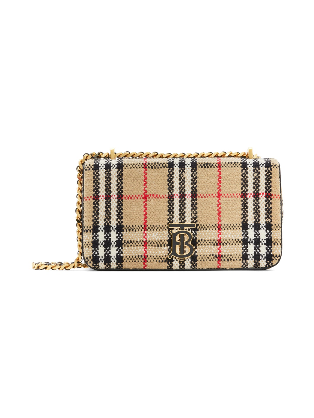 Woven cotton-blend shoulder bag in beige. Signature check pattern, buffed leather trim, and hand-painted edges throughout. · Sliding curb-chain shoulder strap · Logo hardware at face · Foldover flap with magnetic press-stud closure · Patch pocket at interior · Twill lining · Gold-tone hardware · H5.5 x W9 x D2.75 in Supplier color: Archive beige