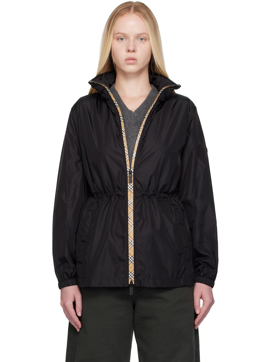 Lightweight nylon technical satin jacket. · Stowaway hood at stand collar · Zip closure with check-patterned placket · Elasticized waist and cuffs · Zip closure at waist · Rubberized logo patch at sleeve · Unlined Supplier color: Black 100% nylon. Made in Thailand 252376F063009