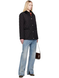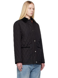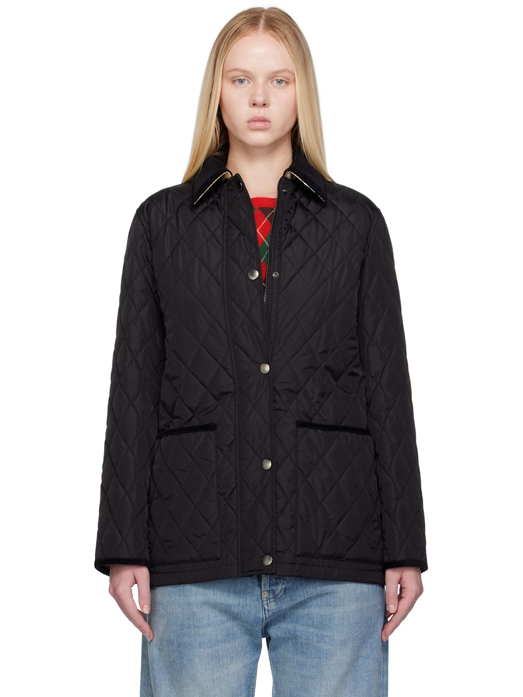 Nylon technical satin jacket. · Insulated and quilted · Corduroy spread collar · Zip closure with press-stud placket · Patch pockets at waist · Corduroy trim at pockets and cuffs · Logo flag at side seam · Check-patterned cotton twill lining · Antiqued silver-tone hardware Supplier color: Black/Sand check Body: 100% nylon. Fill: 100% polyester. Lining: 100% cotton. Made in Thailand 252376F063013